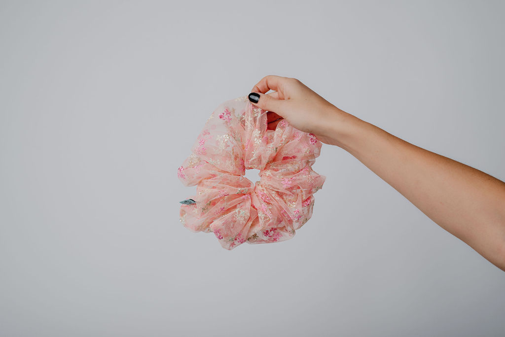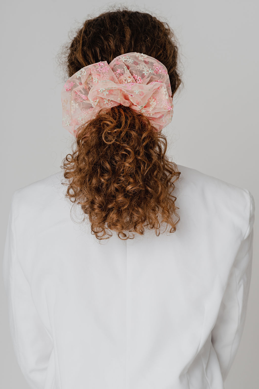 Rankų darbo plaukų gumytė pagaminta iš gipiūro.